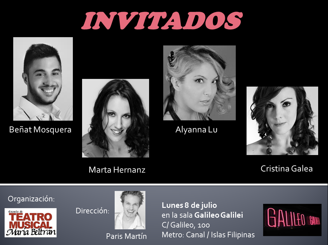 Invitados se representará el próximo 8 de julio a las 21:00h en la sala Galileo Galilei de Madrid, dentro de la Muestra Artística de fin de temporada de la Escuela de Teatro Musical de María Beltrán. Un original espectáculo con voces en directo que reúne todas las características de las grandes obras de teatro musical, en formato de «microteatro» (con una duración de 30 minutos).